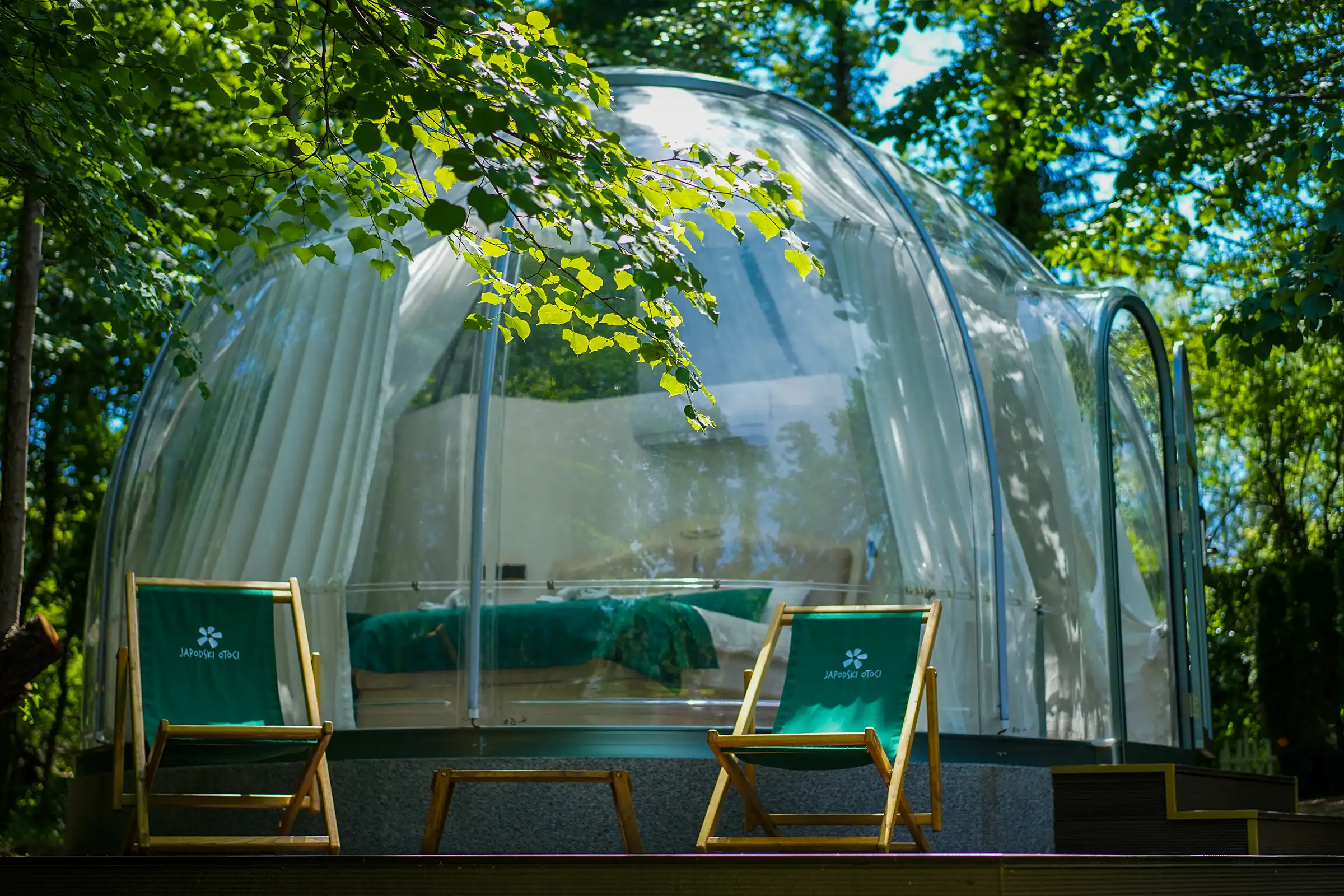 Genießen Sie den Sternenhimmel aus einer komfortablen Kuppel, die mit einer Dusche für vollkommene Erfrischung in der Natur ausgestattet ist.